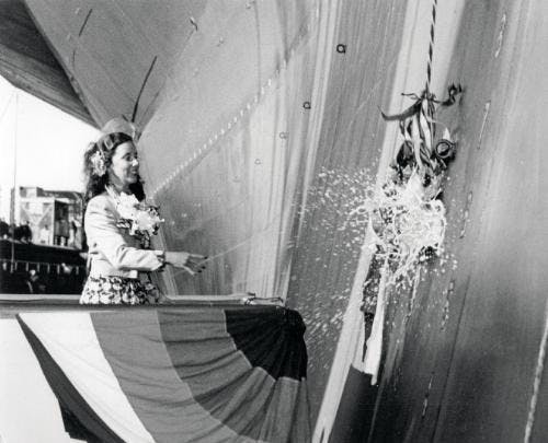 Pleasant weather greeted the attendees as the bow towered over a special barge that floated into place to support the christening party. The ship’s sponsor was Barbara Cox Ripley, daughter of James M. Cox, a candidate for president in 1920, whose running mate was Franklin D. Roosevelt. Also present on the ceremonial barge was Lt. George Gay, the sole survivor of Torpedo Squadron 8 (VT-8) from the Battle of Midway in 1942.