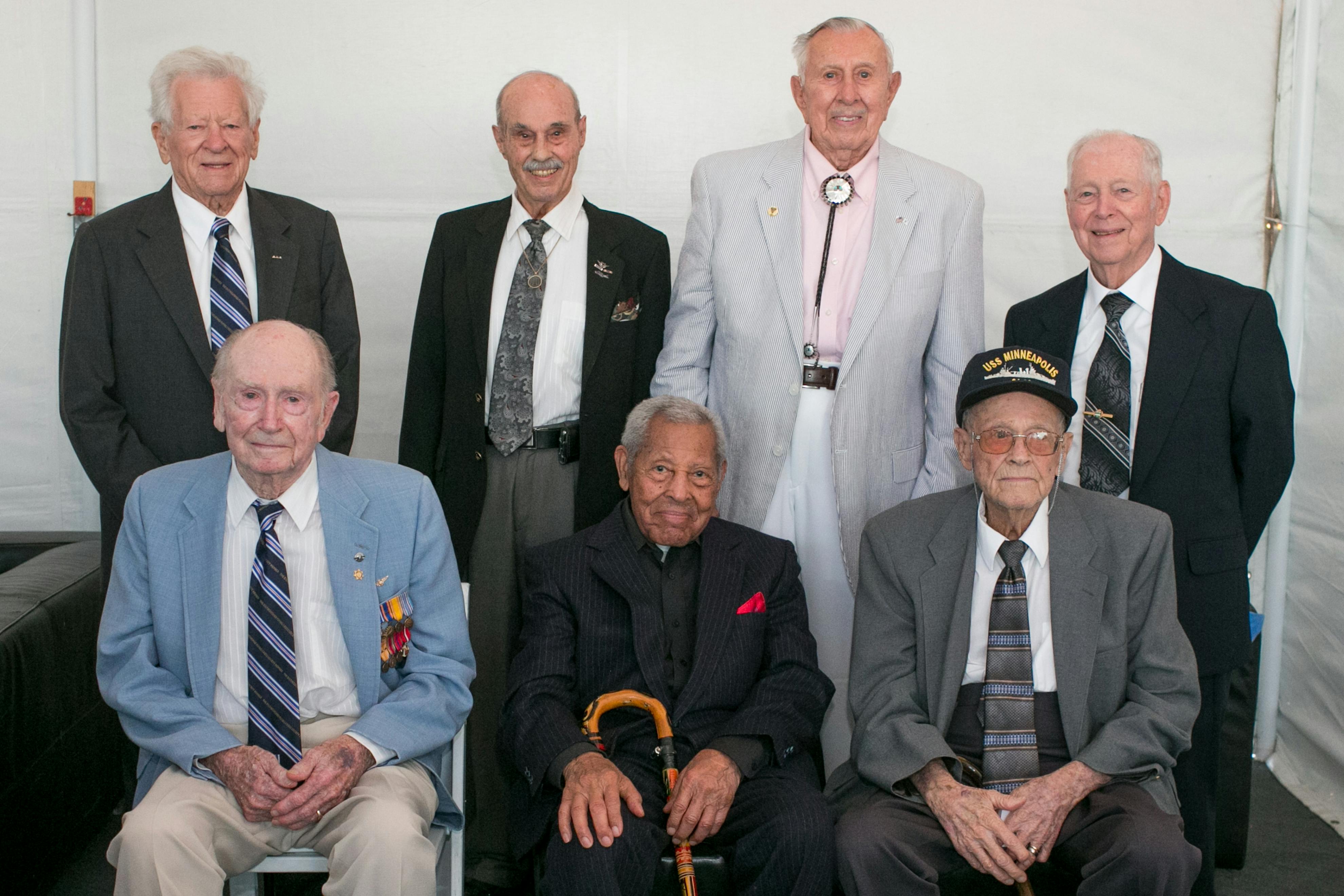 The surviving heroes of the Battle of Midway, for which our ship was named, were honored. The heroes honored in person were: (back) Rudy Matz, Charles Monroe M.D., Ervin Wendt, Edward McKenna, (front) Geoffrey 'Jeff' Blackman, Andy Mills, and Elton Frazier.
